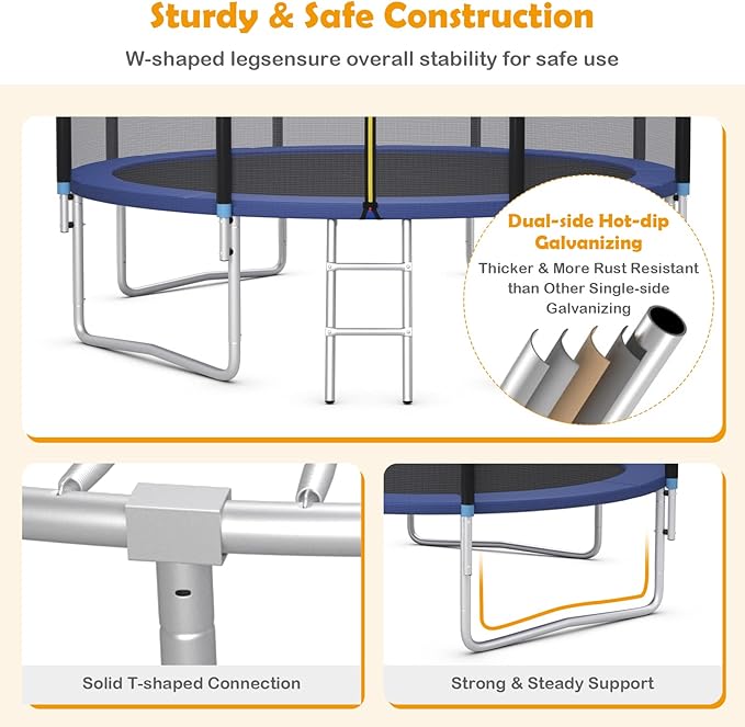 - Sturdy & Durable Construction: The trampoline for children and adults is crafted with galvanized steel frame, which is characterized by great rust resistance and durability. Foam covered on the frame can effectively prevent corrosion to ensure long-term outdoor use. Moreover, the legs strongly support the trampoline to make you jump in a more stable condition.