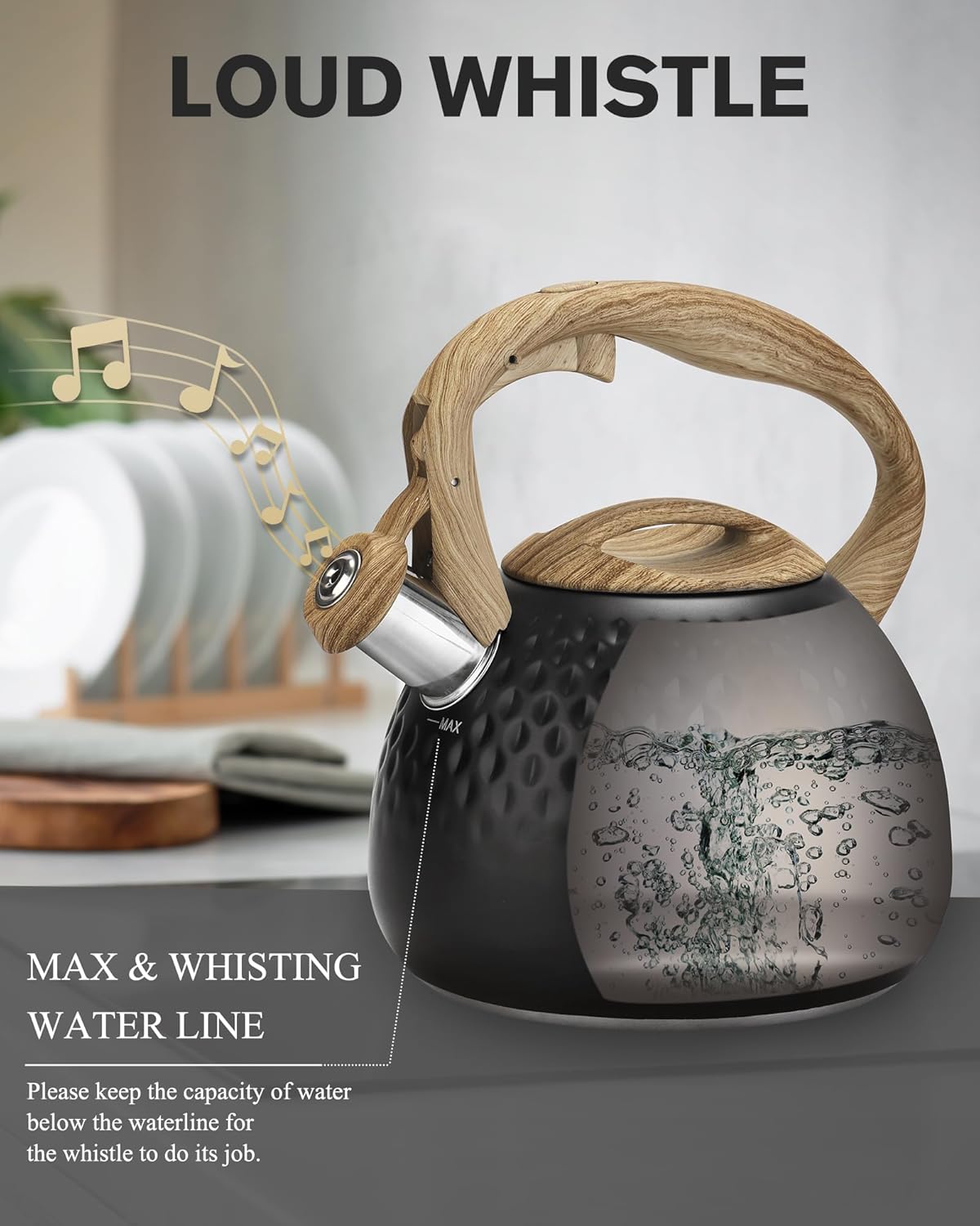 - Loud Whistle Kettles: This whistling tea kettle has a tight-fitting lid that keeps steam in the hot teapot for quick heating, and the teapot will whistle to remind you after boiling water to prevents the kettle from boiling dry