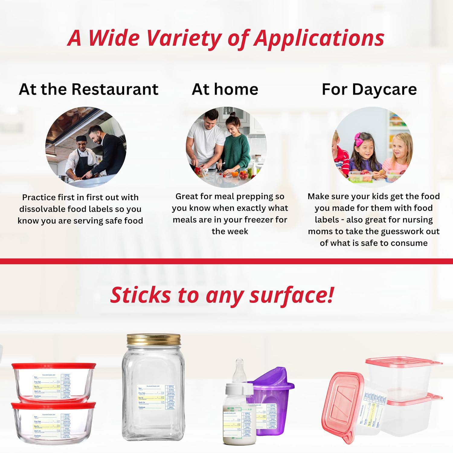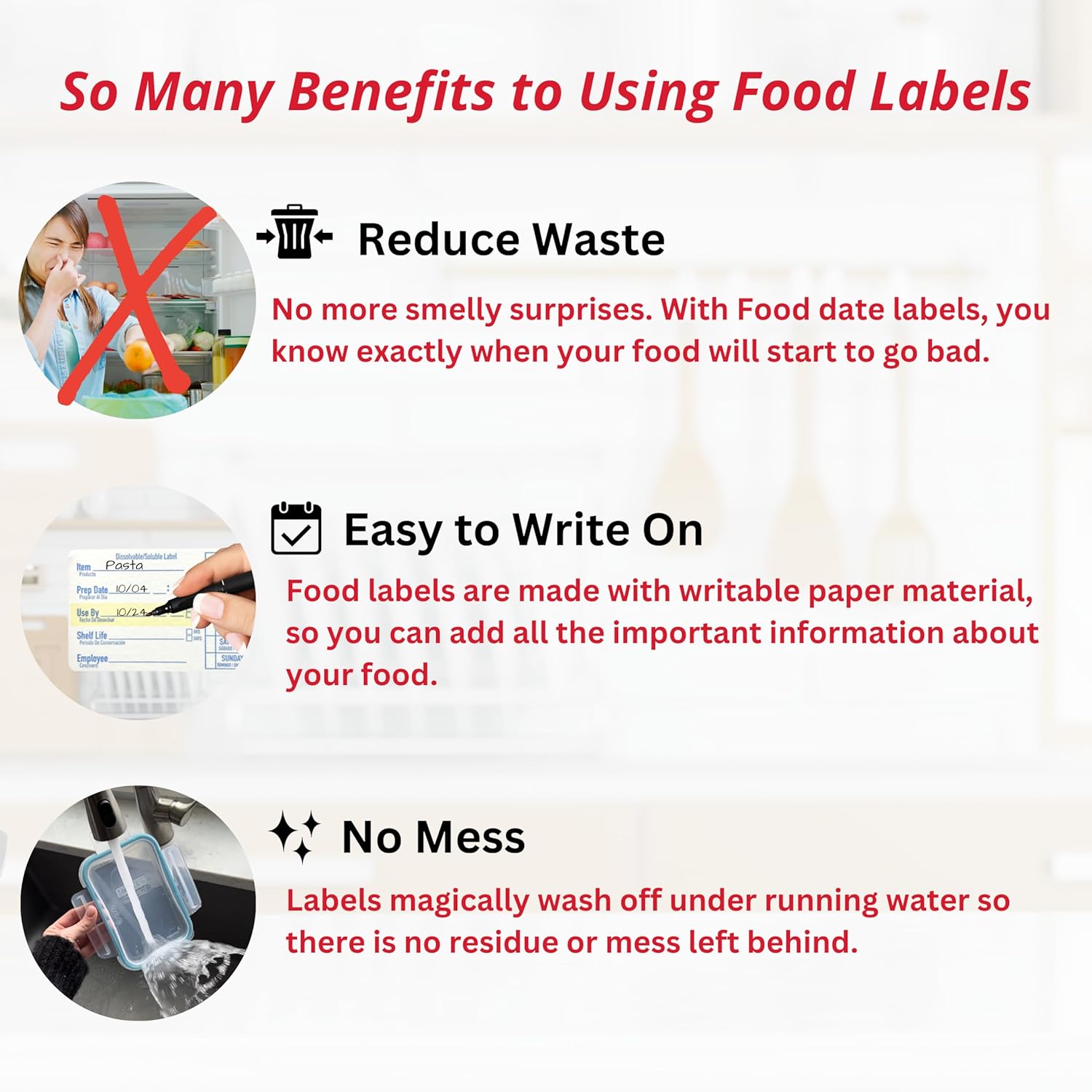 - Fully Dissolvable: These labels for food containers dissolve completely in water, whether in the dishwasher or under running water, leaving no sticky residue behind. They are perfect for labeling food containers or freezer storage and can be effortlessly removed after use.