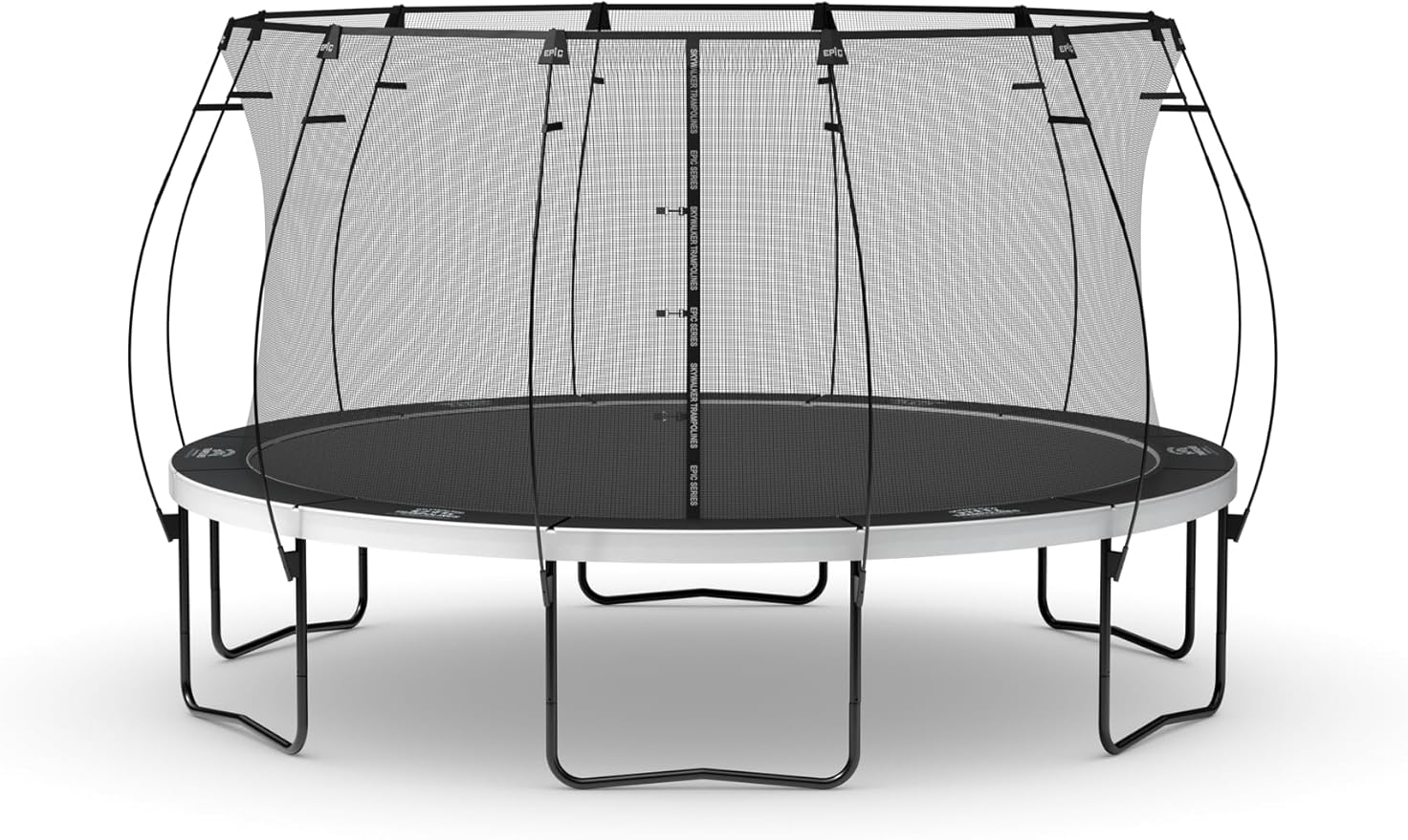 - EPIC PERFORMANCE: On this recreational trampoline, enjoy a premium bounce with a higher spring count suspended from a rust-resistant galvanized steel frame. Instead of the typical six enclosure poles, this trampoline for kids and adults features 12 flex rods that cushion and absorb impact on the enclosure net.