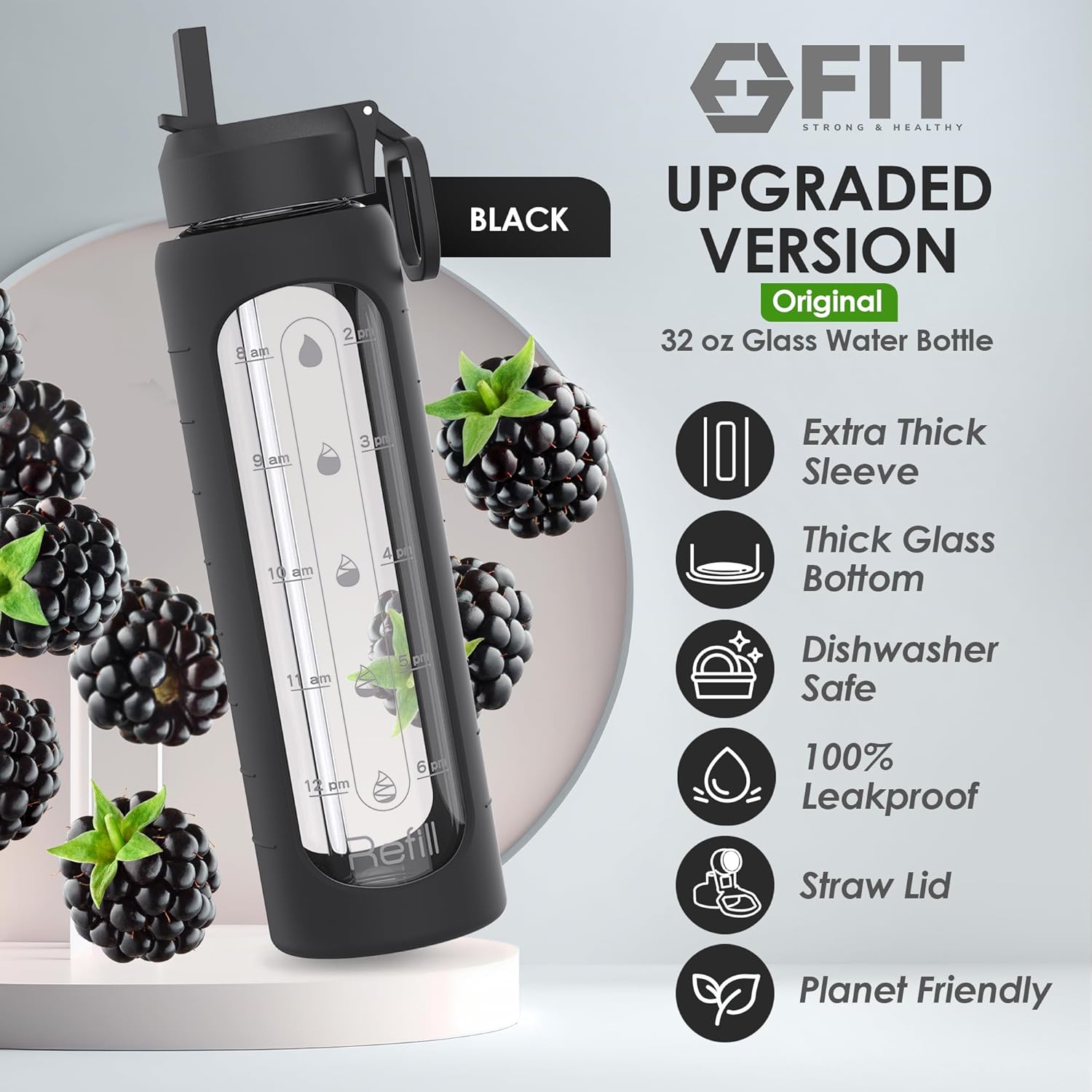 - Stay hydrated all day long: Say goodbye to constant refills; with just one refill in the afternoon, you can effortlessly achieve your daily water intake target whether you're at the gym, in the office, or at home; our large glass water bottle has time marks and ml measurements printed directly on the bottle, helping you stay on track with your water intake; it is leakproof, reusable, and makes an excellent gift for wellness-oriented individuals and fitness enthusiasts of all genders