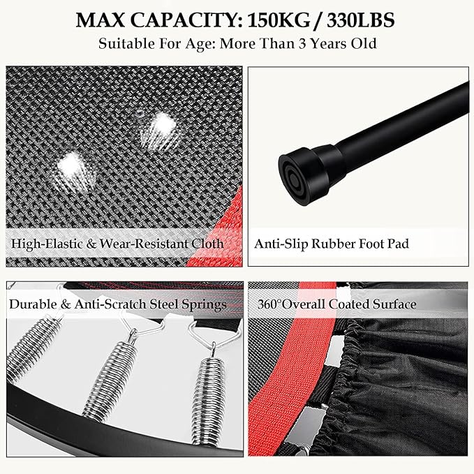 - π¦π§π¨π₯ππ¬ π₯πππ’π¨π‘πππ₯ π§π₯ππ π£π’πππ‘π ππ’π₯ πππ¨ππ§π¦ & ππππ¦:This fitness trampoline for adults is built with a durable steel frame, 8 sturdy legs, and 40 heavy-duty stainless steel springs for enhanced stability and support. The wear-resistant PP mat offers a spacious 40"/48" jumping area, making it the perfect exercise trampoline for anyone. With a maximum weight capacity of 330/440 lbs, it promises a safe and enjoyable jumping experience