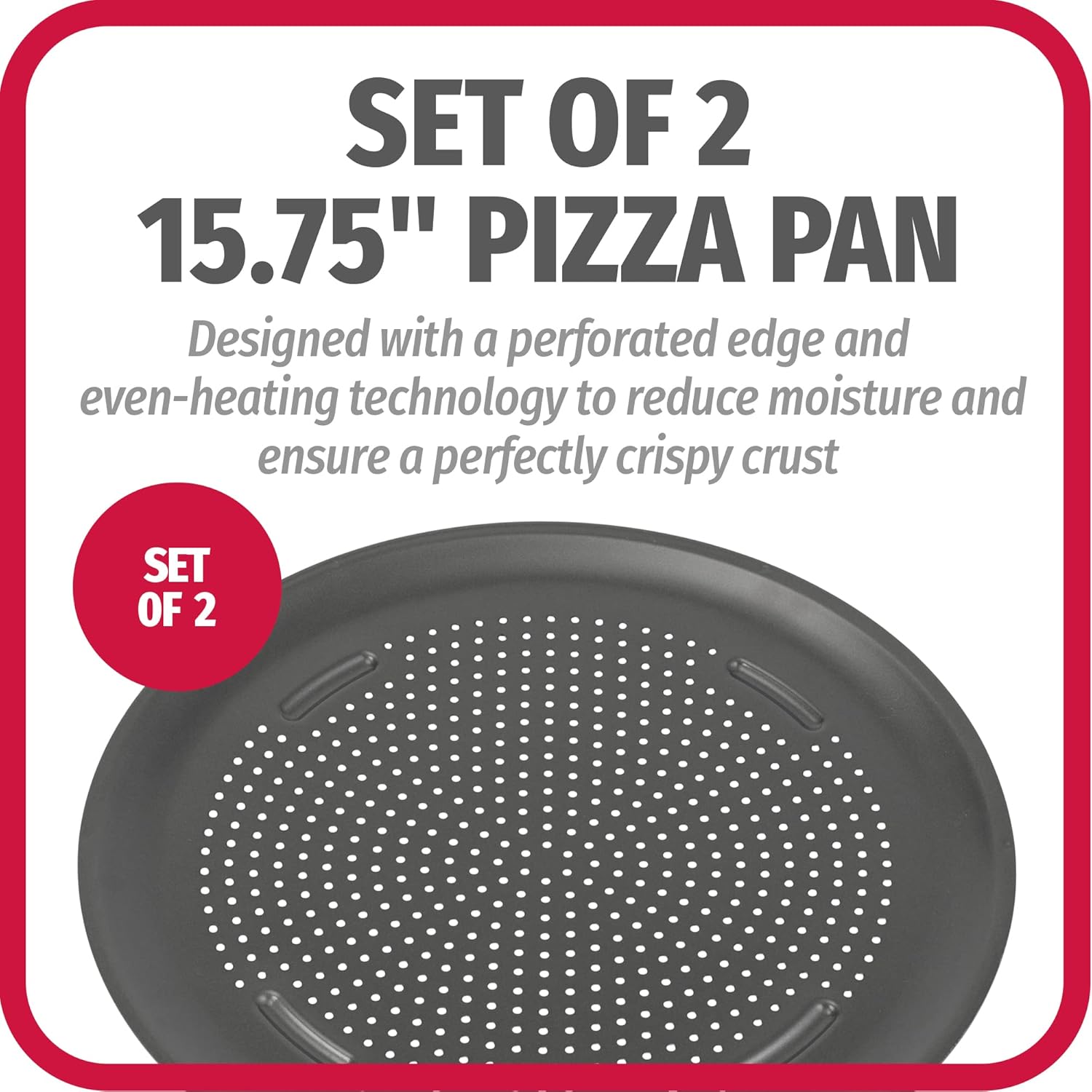 - SET OF TWO 15.75" NONSTICK PIZZA PANS: Air-insulated and perforated to reduce moisture while baking frozen or homemade pizzas or heating up leftover slices to promote a crispier crust for a fresh taste