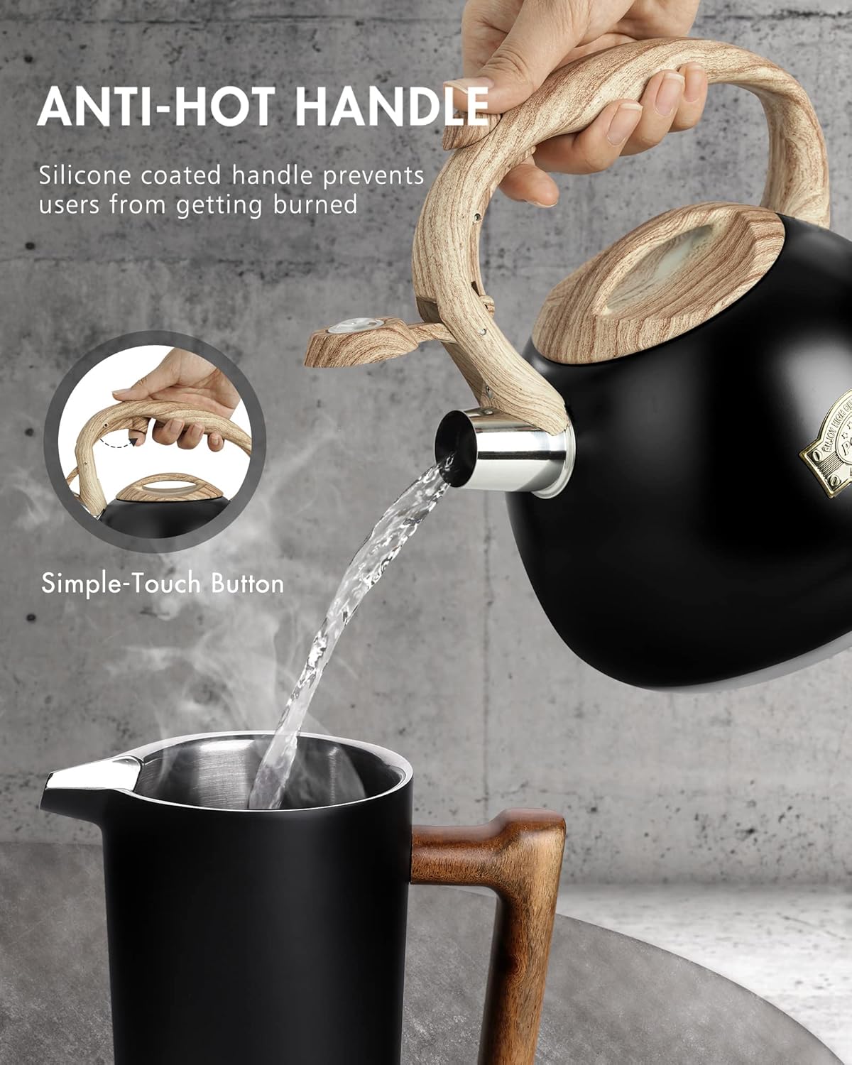 - Anti-Hot Handle: Silicone coated handle allows you to grab the teapot without risking burns. The ergonomic shape maximaze your comfort to lift and pour. Simple touch button provides easy open & close to make one hand pouring possible.