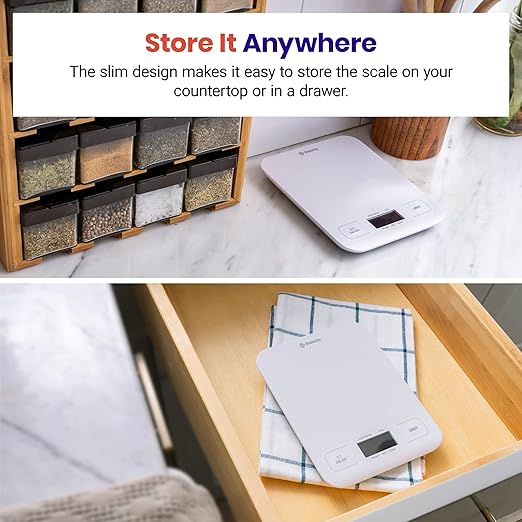 - Easy to Store: With dimensions of 7.2 x 5.7 x 0.7 inches, you can easily store the scale on your countertop or in a drawer