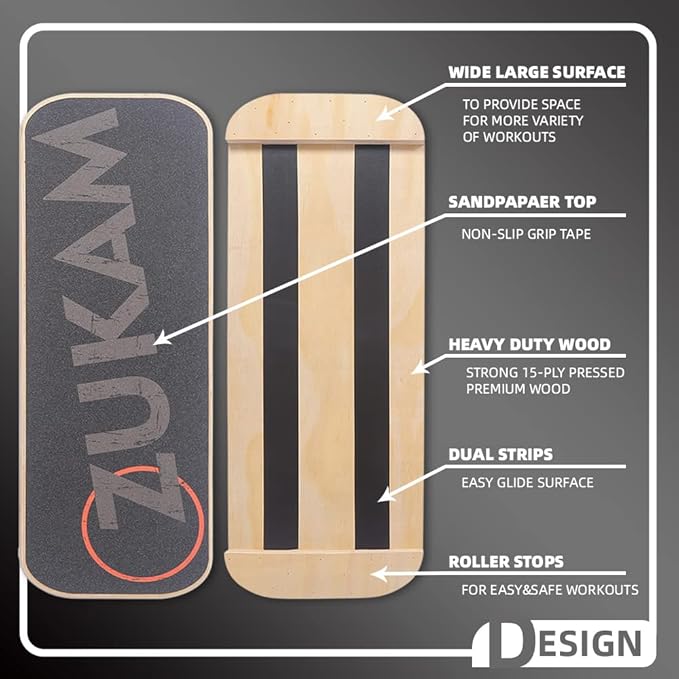 - [Whatβs included] - The Zukam Balance Board comes with board, roller and workout guide. The board measures 75x28cm , and the roller has a diameter of 11cm and a length of 41.8cm.