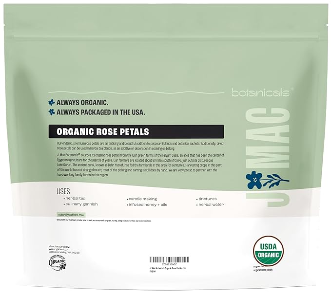 - CERTIFIED ORGANIC ROSE PETALS - J. Mac Botanicals sources its organic dried rose petals from the lush green farms of the Fayoum Oasis in Egypt, the center of Egyptian agricultural for thousands of years.