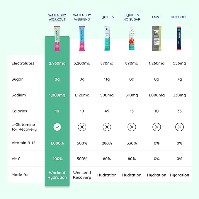 - Product Benefits : Waterboy Workout Hydration | 2,960mg Sugar Free Electrolyte Powder Packets | L-Glutamine + Vitamins | No Sugar, All Natural, Gluten Free | 15 Drink Stick Mixes (Strawberry Lemonade) Waterboy Workout Hydration | 2,960mg Sugar Free Electrolyte Powder Packets | L-Glutamine + Vitamins | No Sugar, All Natural, Gluten Free | 15 Drink Stick Mixโฆ See more