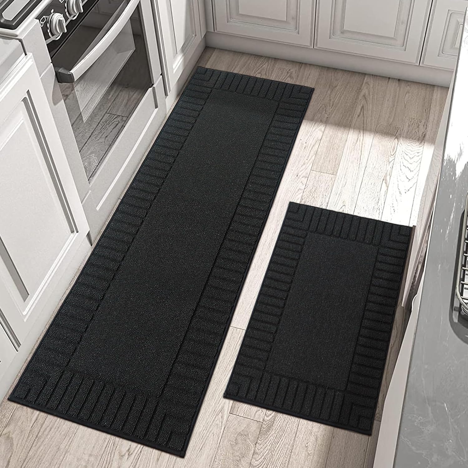 BEQHAUSE-Kitchen-Rugs-and-Mats,2 PCS Non Slip Kitchen Floor Mat,Absorbent Kitchen Rug Sets Machine Washable Kitchen Runner Rug Black Kitchen Mat 24x35inch/24x60inch