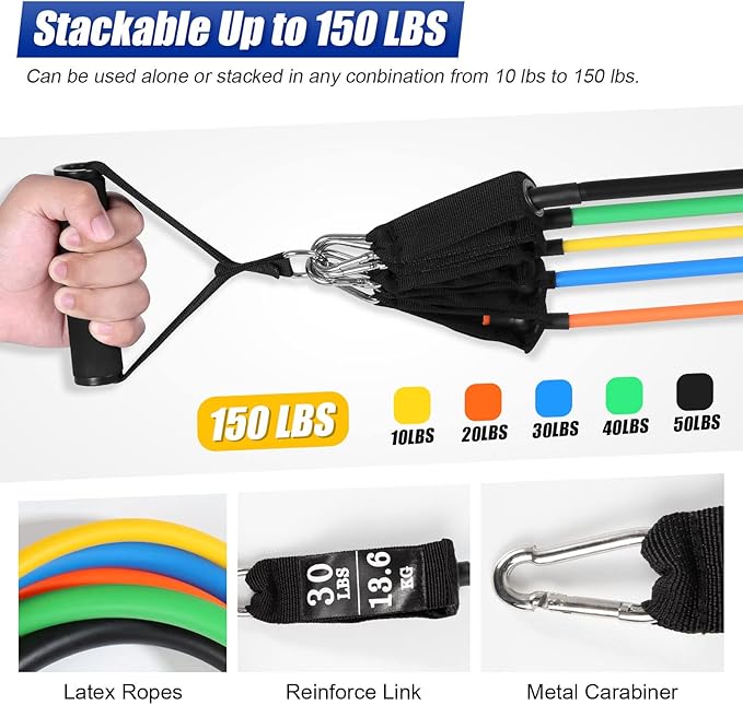 - 【12pcs in one set】: 5pcs different resistance bands[ Black (50lbs) > Green (40lbs) > Blue (30lbs) > Orange (20lbs) > Yellow (10lbs)], 2pcs anti-slip handles, 1pcs premium door anchor, 2pcs ankle straps,1pcs workout guide and 1pcs carry gift bag, you can have all in one set, easy to train, easy to carry for travelling.