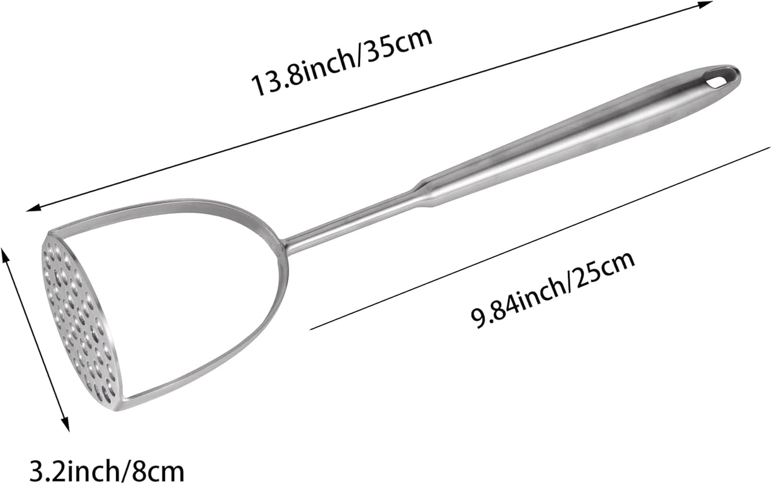 - One-Piece Seamless Design: Made with an integral molding process, this stainless steel potato masher has no weld joints, reducing food buildup. A hanging hole at the end of the handle allows for easy storage.