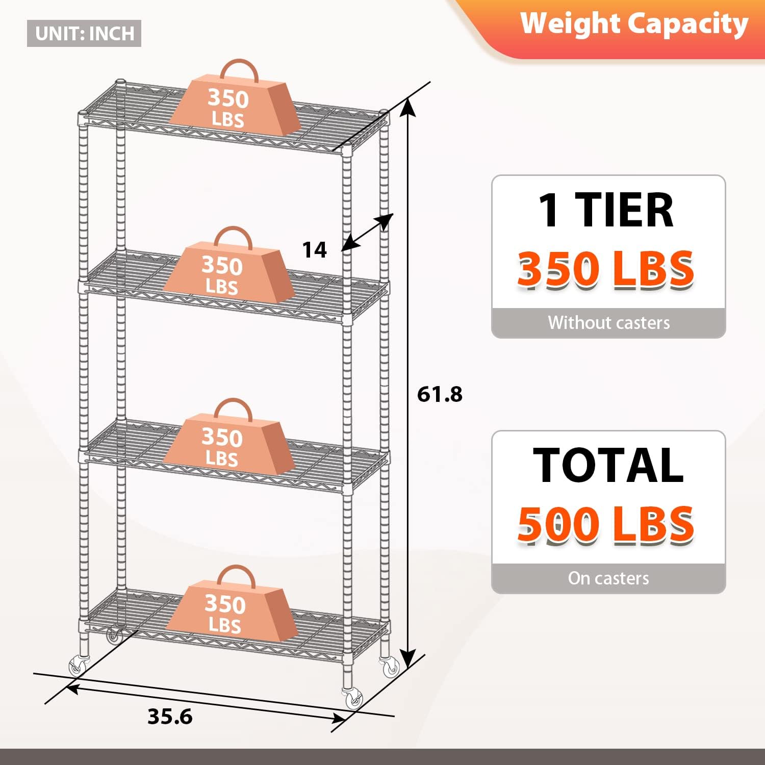 - √【LARGE STORAGE AND STUDY】:This storage shelves provide an enormous amount of space and strong shelves.The wire shelving unit doesn't occupy too much space,but it can create more additional space.Maximum weight capacity per shelf is 350lbs when weight is equally distributed. Maximum entire unit weight capacity is 500lbs when equally distributed on casters..Dimensions: 35.6"L x 14"W x 61.8"H.