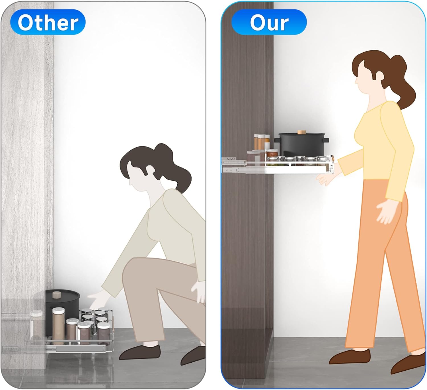 - Pull Out Drawers for Kitchen Cabinets with Adjustable Height: The improved slide out cabinet organizer is more flexible than the traditional pull out cabinet organizer. Its guide rail is installed on the side of the cabinet rather than the bottom of the cabinet. So it can be installed at any height. You can adjust the height of the installation basket according to your comfort. Note: Avoid the hinge of the cabinet during installation