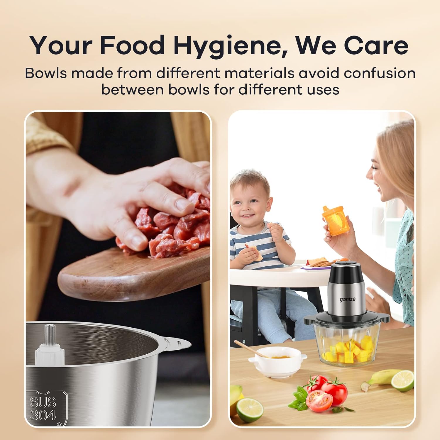 GANIZA Food Processors, Electric Food Chopper with Meat Grinder & Vegetable Chopper - 2 Bowls (8 Cup+8 Cup) with Powerful 450W Copper Motor - Includes 2 Sets of Bi-Level Blades for Fruits/Meat/Nuts