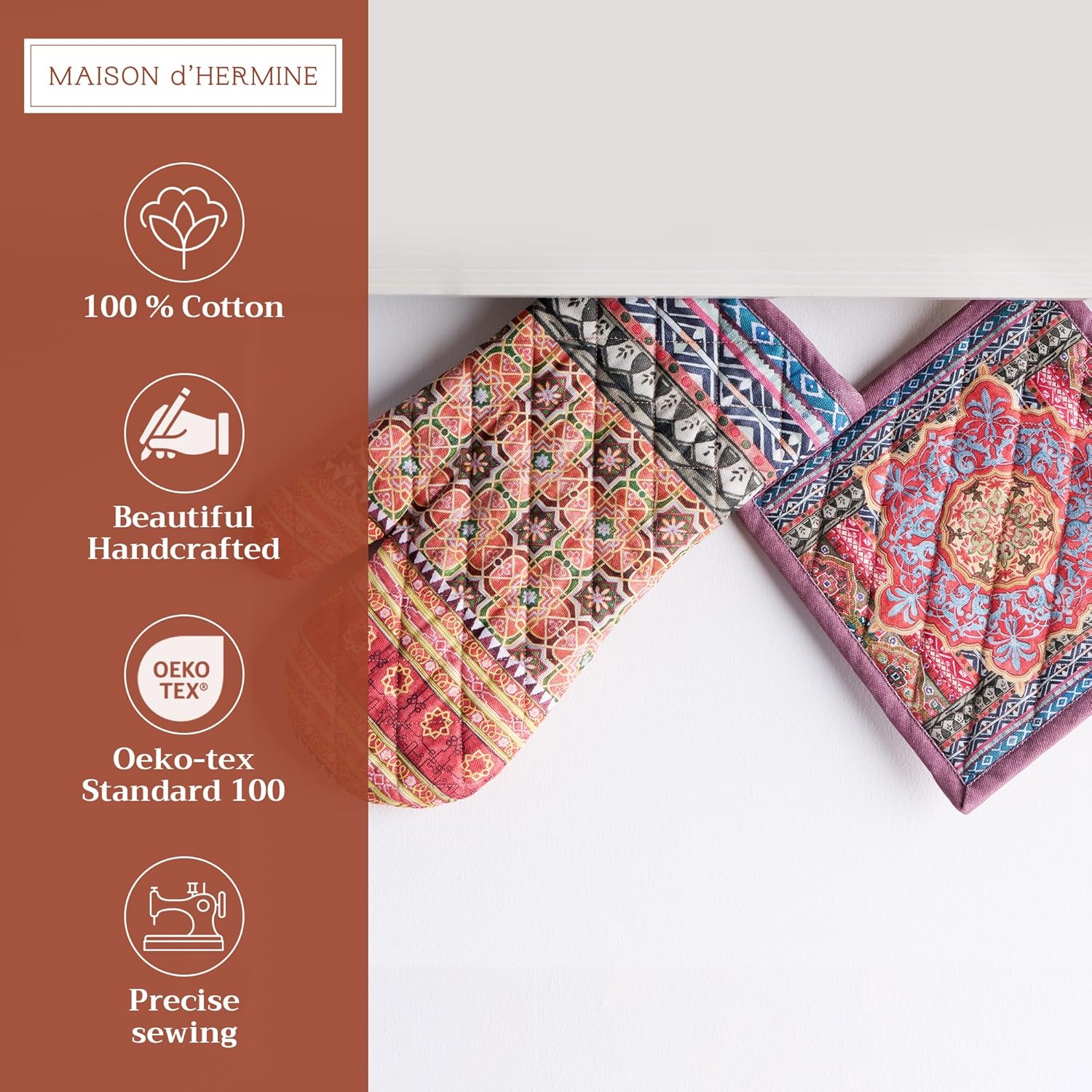 Maison d' Hermine 100% Cotton Oven Mitt & Pot Holder Set (7.5"x13" & 8"x8") Heat Resistant BBQ Cooking Gloves with Loop, Baking, Grilling, Kitchen, Handling Hot Pans (Ispahan)