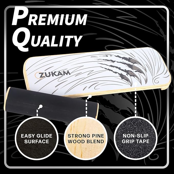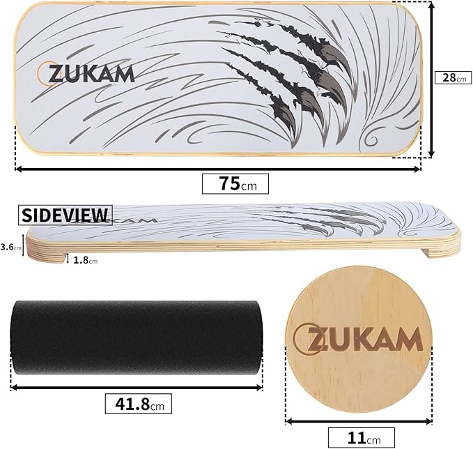 - [Whatβs included] - The Zukam Balance Board comes with board, roller and workout guide. The board measures 75x28cm , and the roller has a diameter of 11cm and a length of 41.8cm.