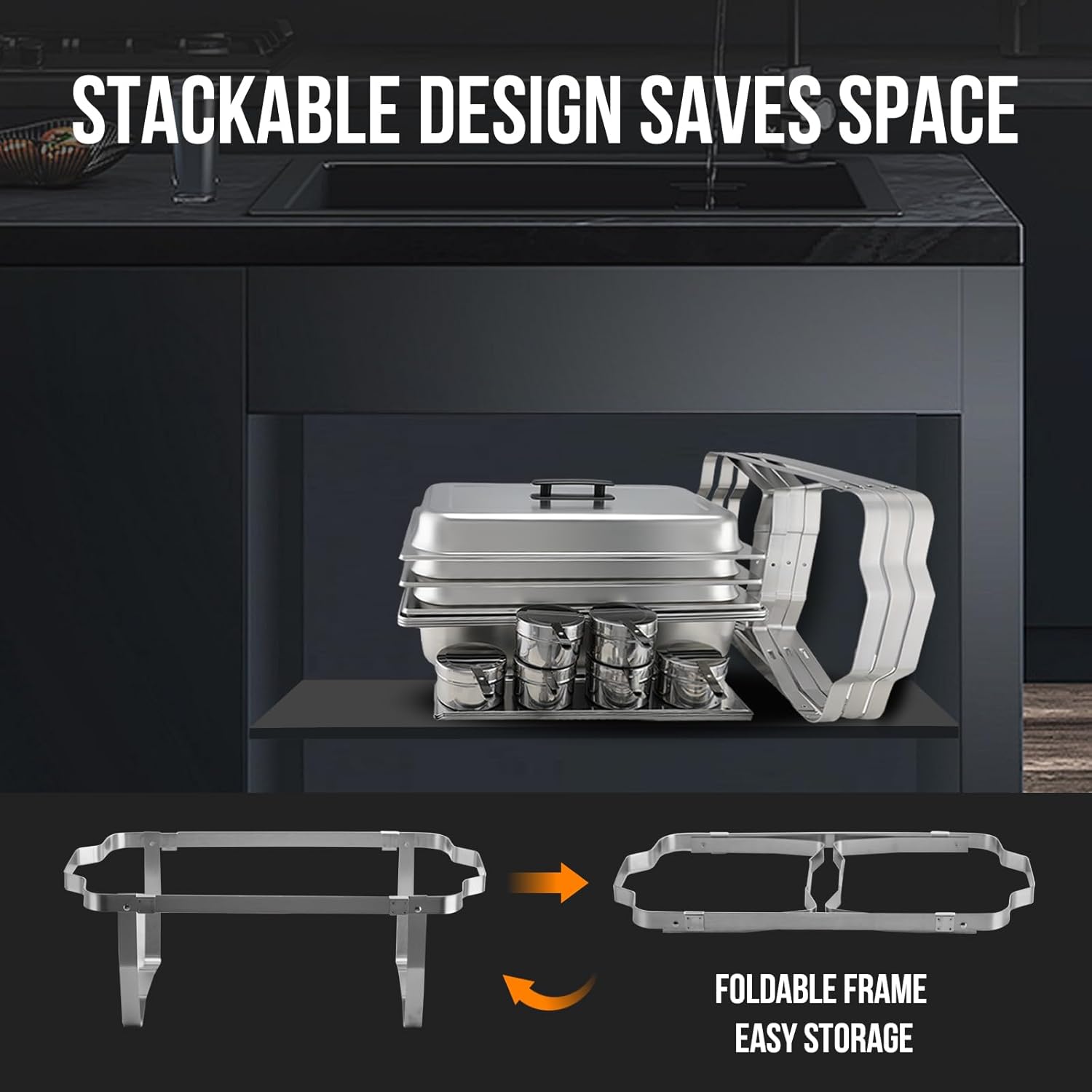 - EFFORTLESS CONVENIENCE - Simply unfold stand, stack pans, buffet servers and warmers is ready in 1 minute, saving a lot of time for party preparation! When you're done using chafers and buffet warmers sets, stackable lids and pans, and foldable frames ensure space-saving storage and transportation. All pans and lid are non-stick and dishwasher-friendly
