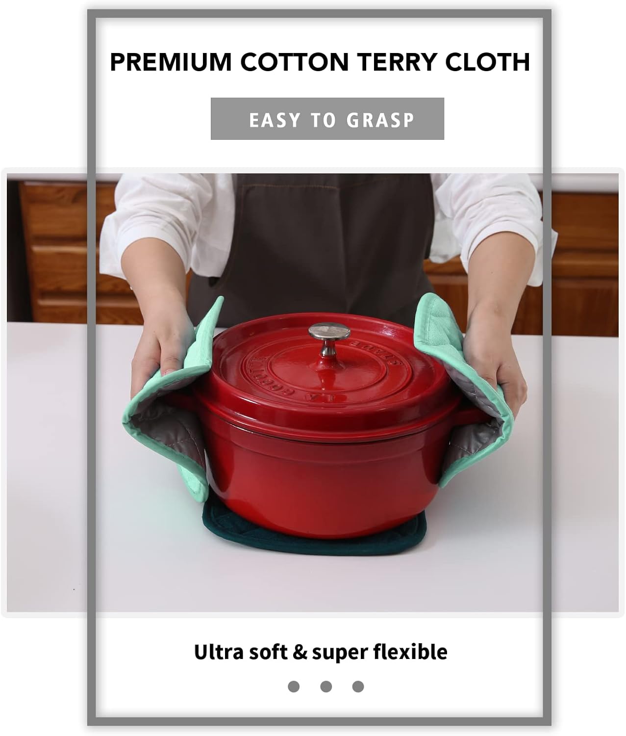 - QUILTED AND PADDED - Heat resistant up to 400 degrees allowing safe removal of baking dishes and cast iron from the oven and hot pots from the stove.
