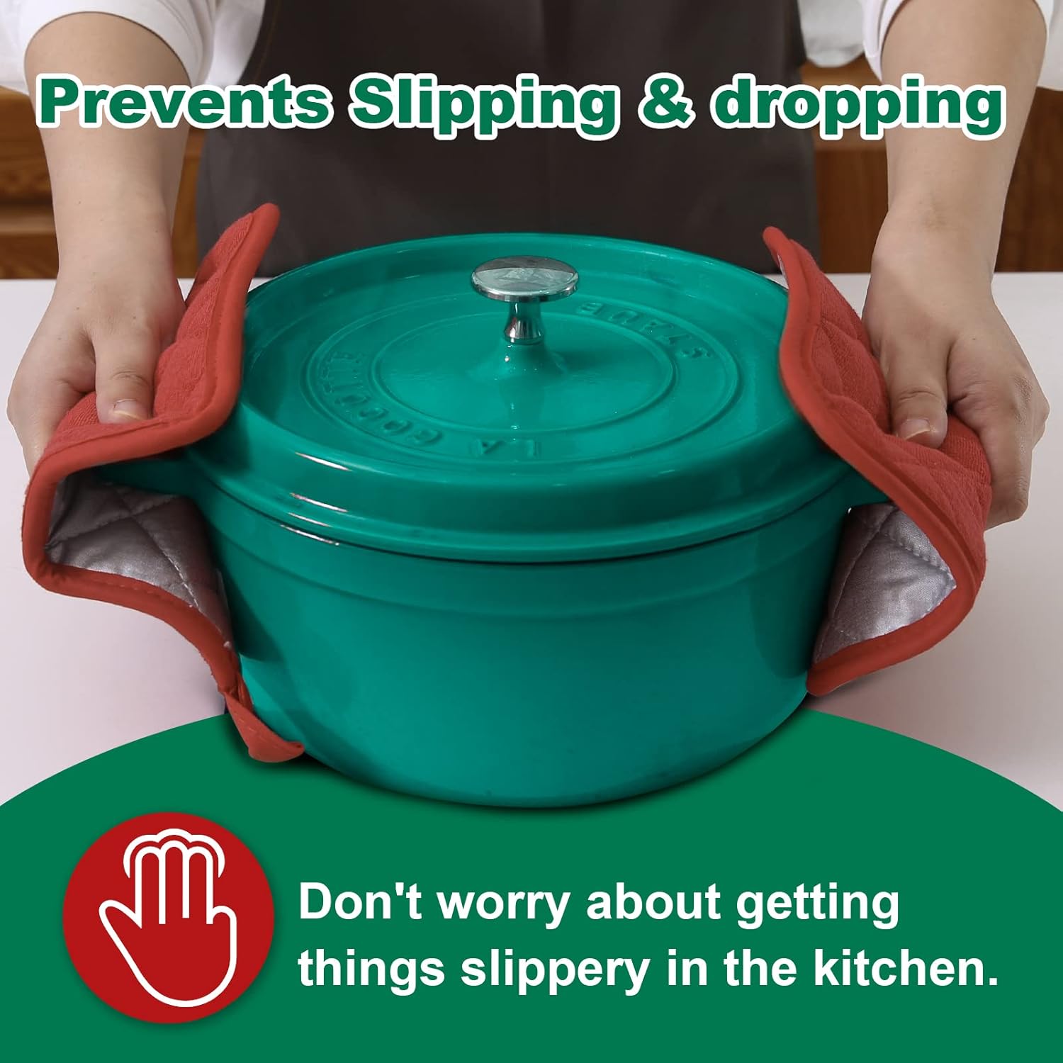 - PROTECT YOU FROM HEAT - The construction of these pot holders for kitchen helps to protect your hands and arms from the heat of the oven. Do not use pot holders in a hot oven or over an open flame.