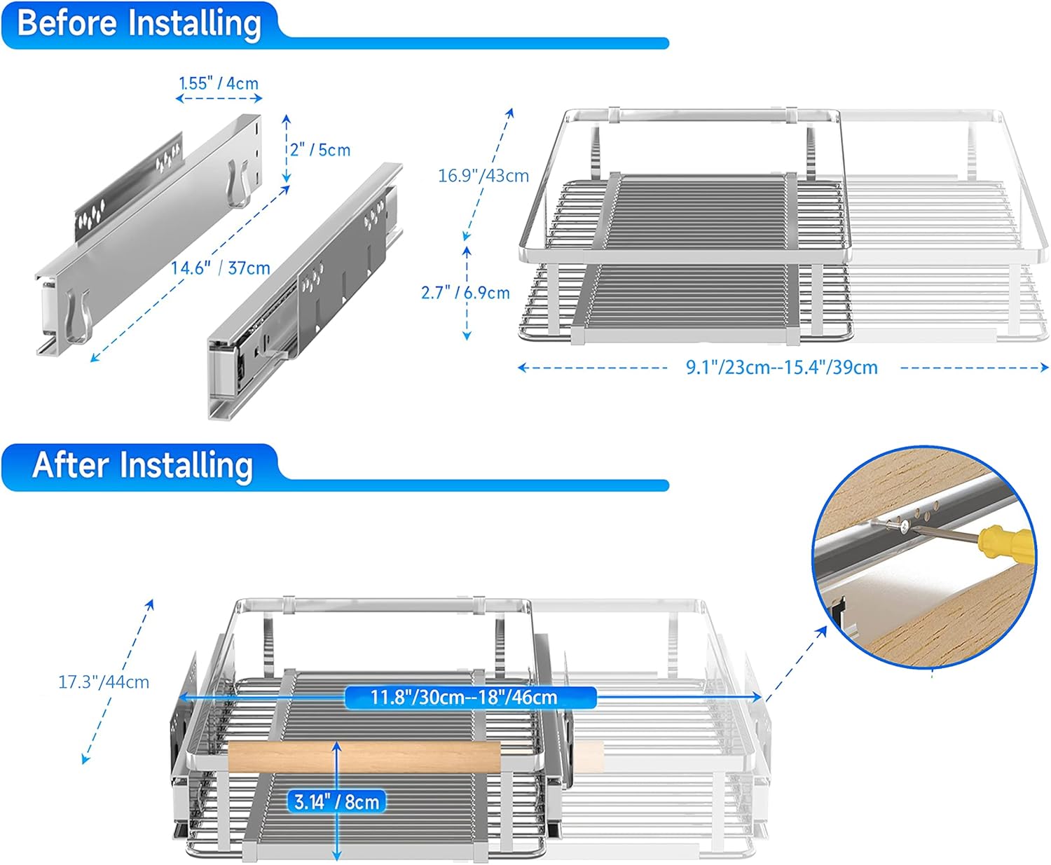 - High Quality Material: The pull out drawers for kitchen cabinets is made of stainless steel, which can directly contact tableware and food, and is very safe, waterproof and rust proof. Stainless steel metal pull out drawers for kitchen cabinets is more durable and more supportive than ABS plastic basket. Simple and low-key colors can match with cabinets of various styles, suitable for a variety of family styles