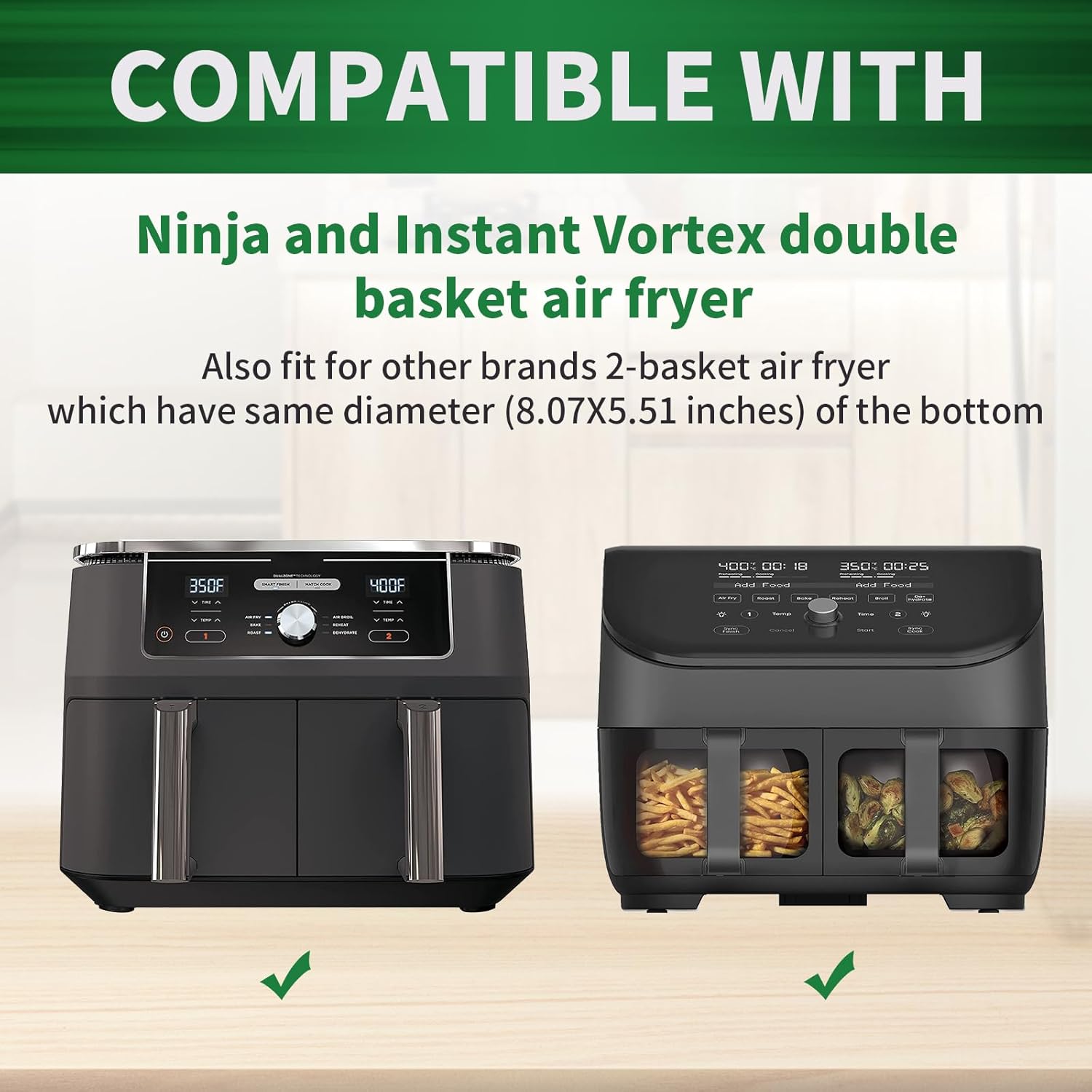 - [Precise Compatibility] 8.07''*5.51''. This air fryer disposable paper liner is perfectly compatible with Ninja dual zone air fryer, Ninja DZ071 air fryer, Ninja DZ201 air fryer, Ninja DZ401 air fryer, Ninja DZ550, Ninja AD305CO air fryer, Ninja DZ201 air fryer and Instant Vortex Plus XL dual basket air fryer. Also fit for other brands/model 2-basket air fryer which have same diameter (8.07X5.51 inches) of the bottom