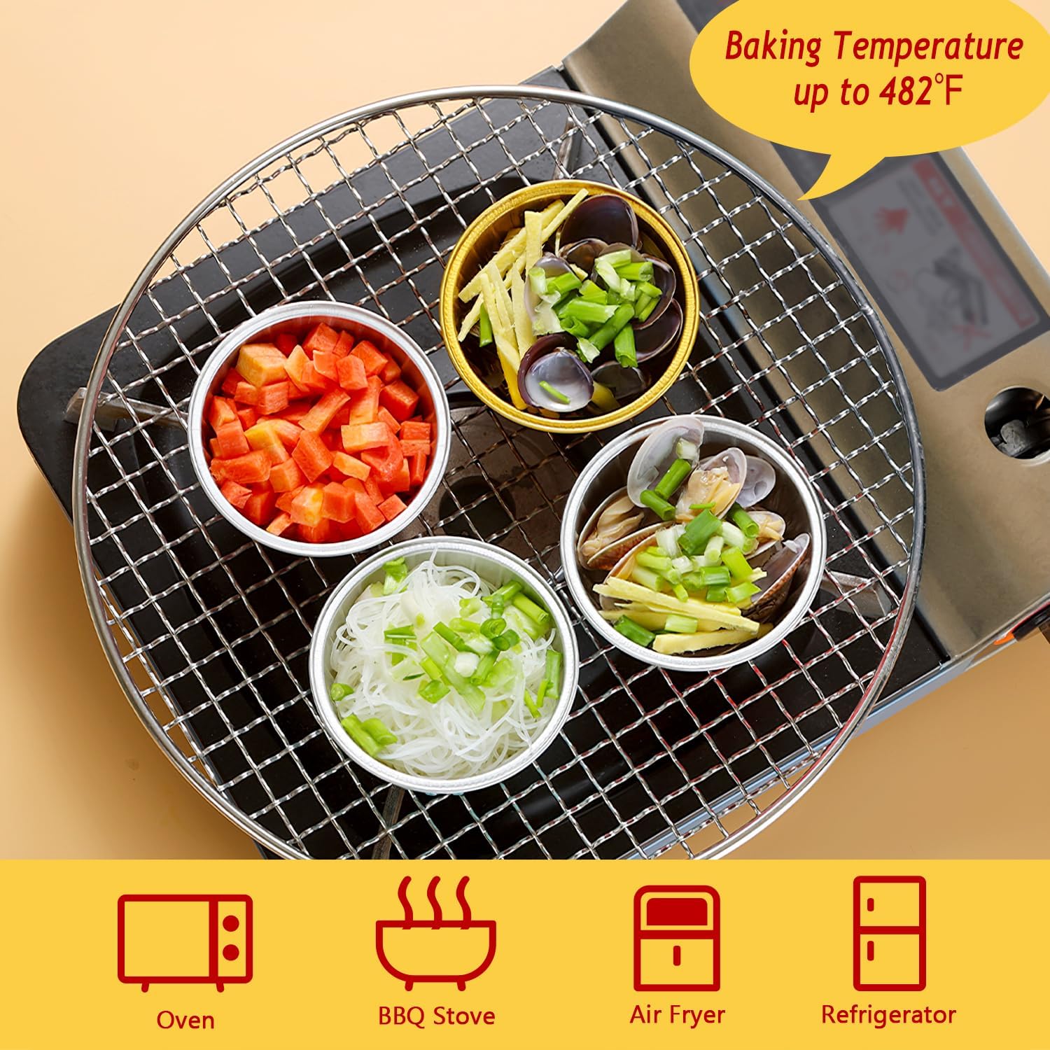 - 【Mini Aluminum Foil Baking Tins】 - These jumbo muffin cups are made of food-grade aluminum foil that has excellent thermal conductivity, shortening baking time. They are oven, grill, air fryer and refrigerator safe and can withstand temperatures of up to 250℃/482℉.(NOTE:The clear lids are not heat resistant!)