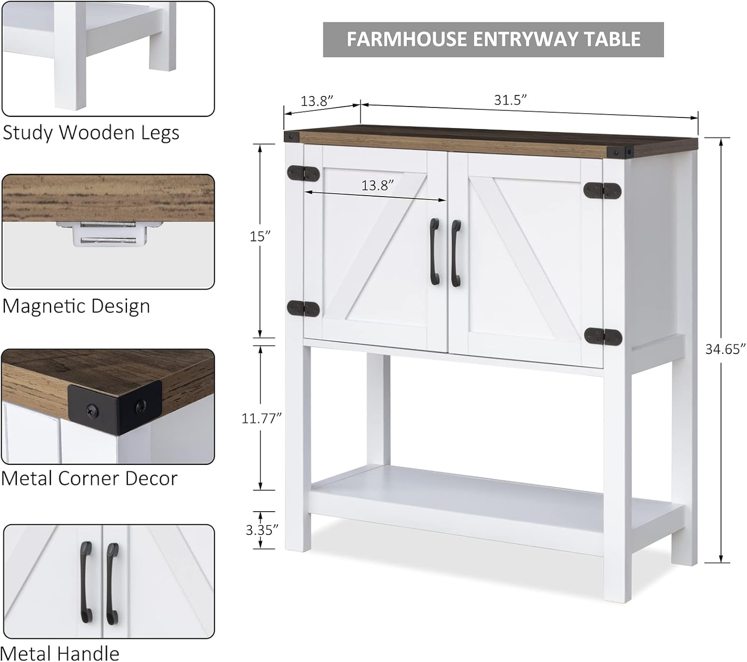 Console Table Coffee Bar Cabinet Sofa Table,31.5 L x 13.8 D x 34.65 H,Entryway Table with 2 Storage Cabinets, Farmhouse Buffet Sideboard for Kitchen, Foyer,Hallway (White)