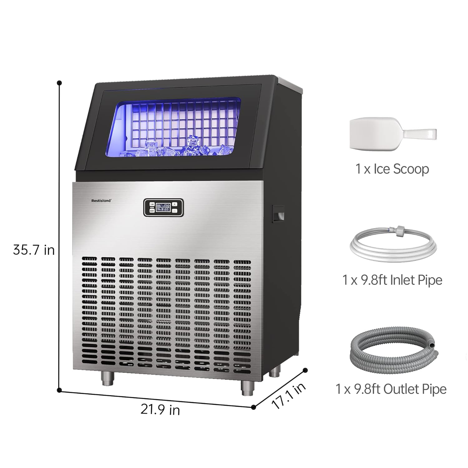 Commercial Ice Maker Machine, 200 lbs/24 Hours, 48 lbs Storage Bin, Stainless Steel, Blue Light, Freestanding, Great for Home or Business, Includes Ice Scoop, Connecting Hose