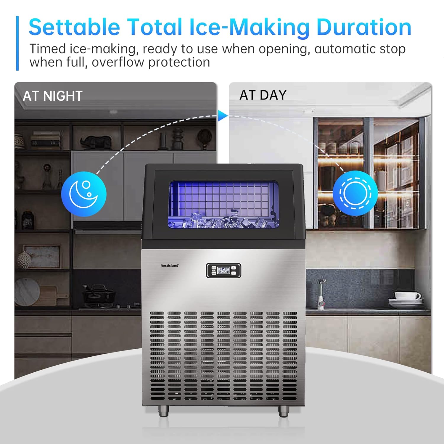 - Smart LCD Panel: You can preset and monitor the process of ice making easily. The thickness of ice cubes can be adjusted by increasing or decreasing ice-making time. Blue-ray and automatic cleaning function make it easier to observe the ice tray and ensure the hygiene of the ice tray