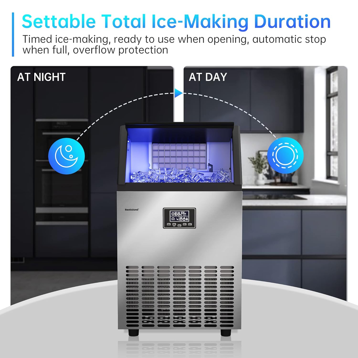 - Smart LCD Panel: You can preset and monitor the process of ice making easily. The thickness of ice cubes can be adjusted by increasing or decreasing ice-making time. Blue-ray and automatic cleaning function make it easier to observe the ice tray and ensure the hygiene of the ice tray.