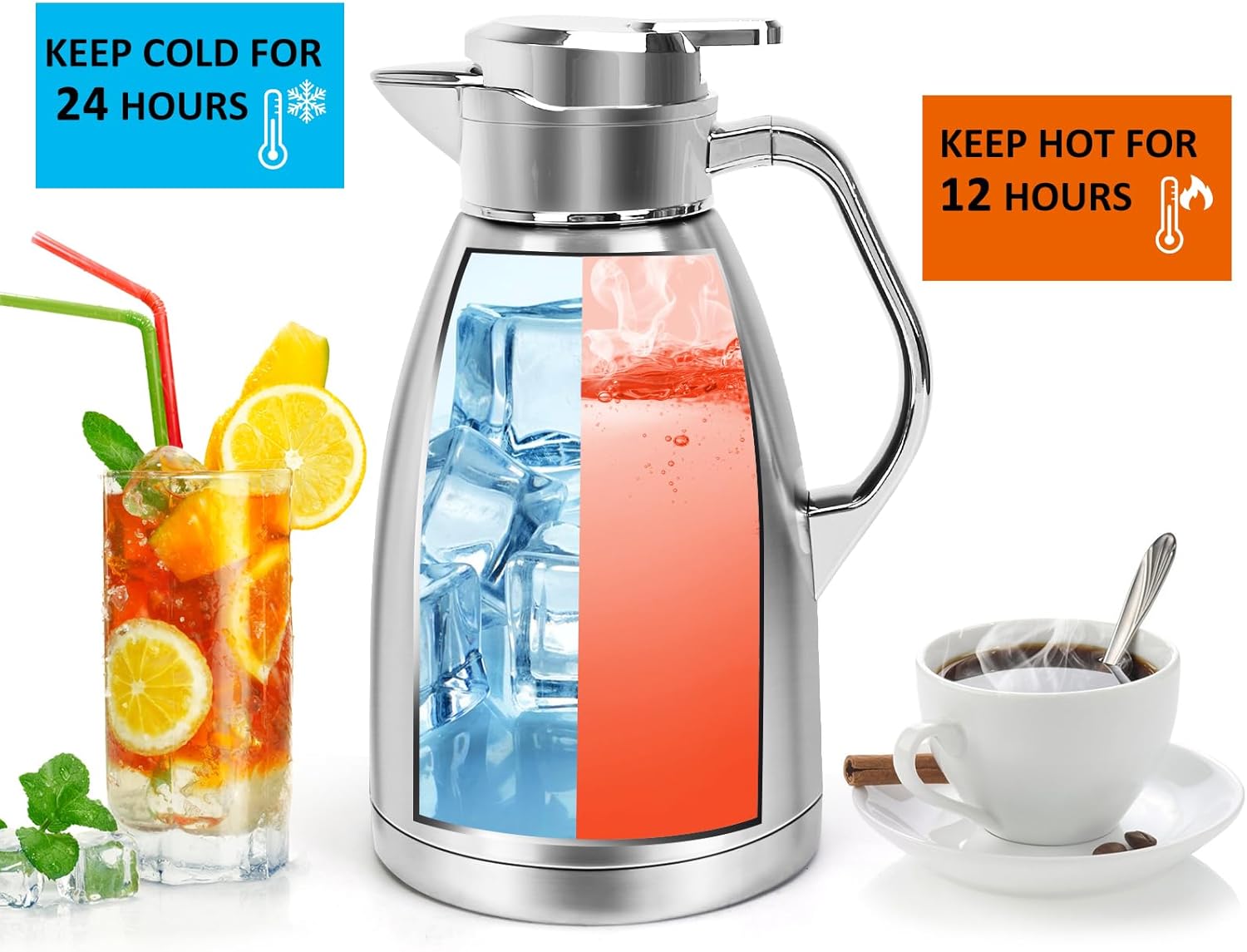- 【VERSATILE USE】 The thermal carafe can be used to hold coffee, juice, tea,milk, coco, wine...makes your cold or hot liquid ready to serve, apply for indoor and outdoor. But we won’t suggest to hold the carbonated drinks which will damage the surface for heat retention in some degree.