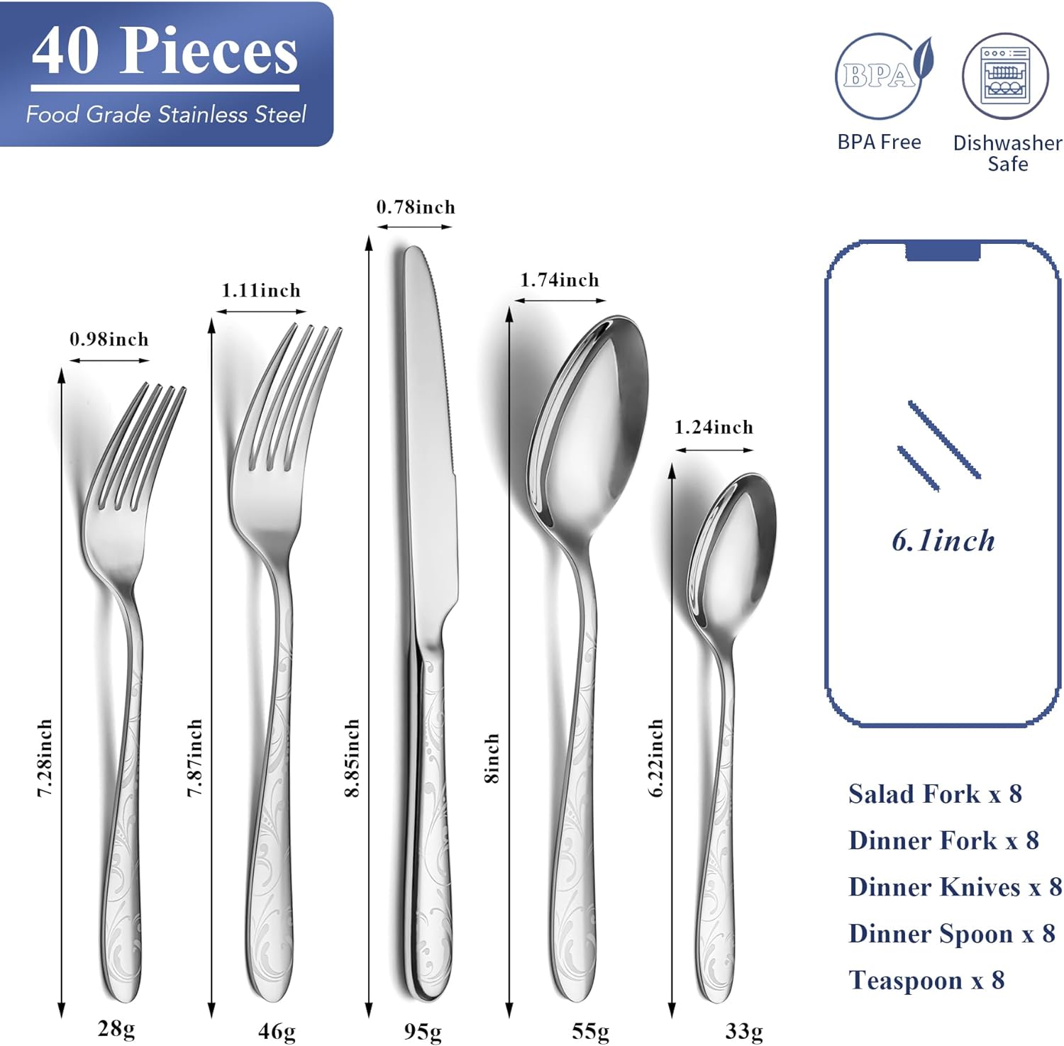 40 Piece Silverware Set Service for 8, EIUBUIE Premium Stainless Steel Cutlery Set, Mirror Polished Flatware Sets with Pattern Handle, Modern Kitchen Eating Utensils Sets Include Spoons Forks Knives