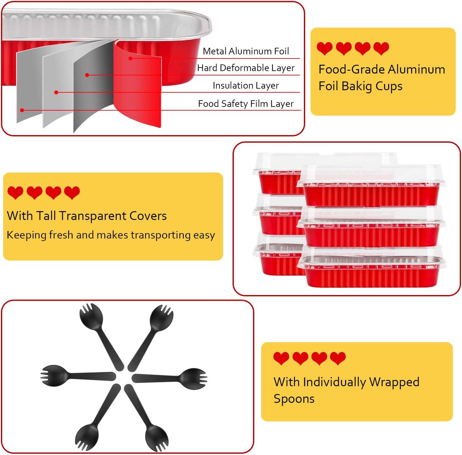 - 【Pack of 100 Sets】 - Including 100pcs mini cake pans with 100 clear lids,and 100 individually wrapped spoons.The mini loaf pan size:6.5”x2.5”x1.2”,the dome lids 0.8” high.Abundant small cake pans with lids are great for bake shops,big parties.