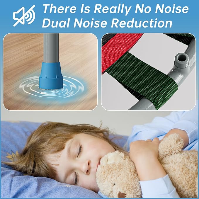 - 【SAFE AND FUN】 The padded handlebar is adjustable from 32.6” to 40.5” which fits your kid’s height perfectly. Kids can use the handlebar for easy grip to control their bounce. This springless trampoline is safer than the spring rebounders, primarily due to more soft parts. There is less of a chance of experiencing pinched fingers or toes, regardless of the safety precautions in place. Moreover, this trampoline has been added with a covering on top of the bands to provide safer jump pad surface