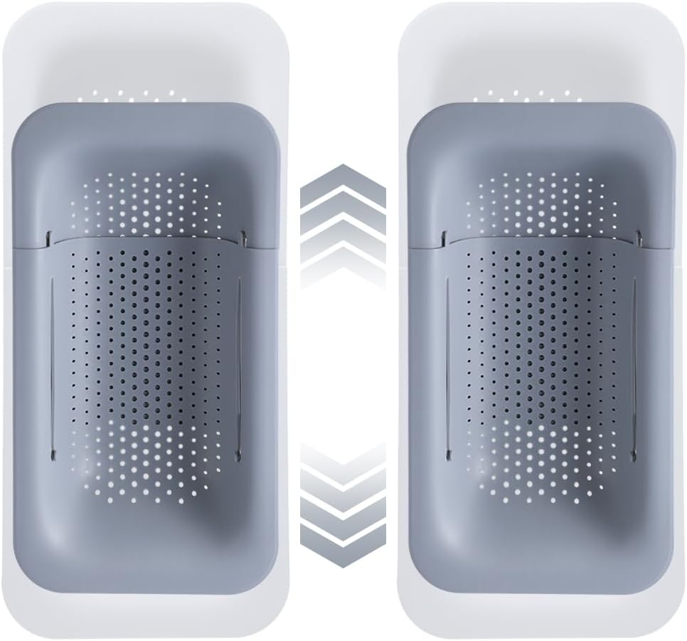 Collapsible Sink Colanders and Strainers Basket Over the Sink Colander Collapsible Colander Extendable Plastic Fruit Vegetable Strainer Drainer Basket for Kitchen(Length 14.3-19.4 inch)(Gray Set of 2)