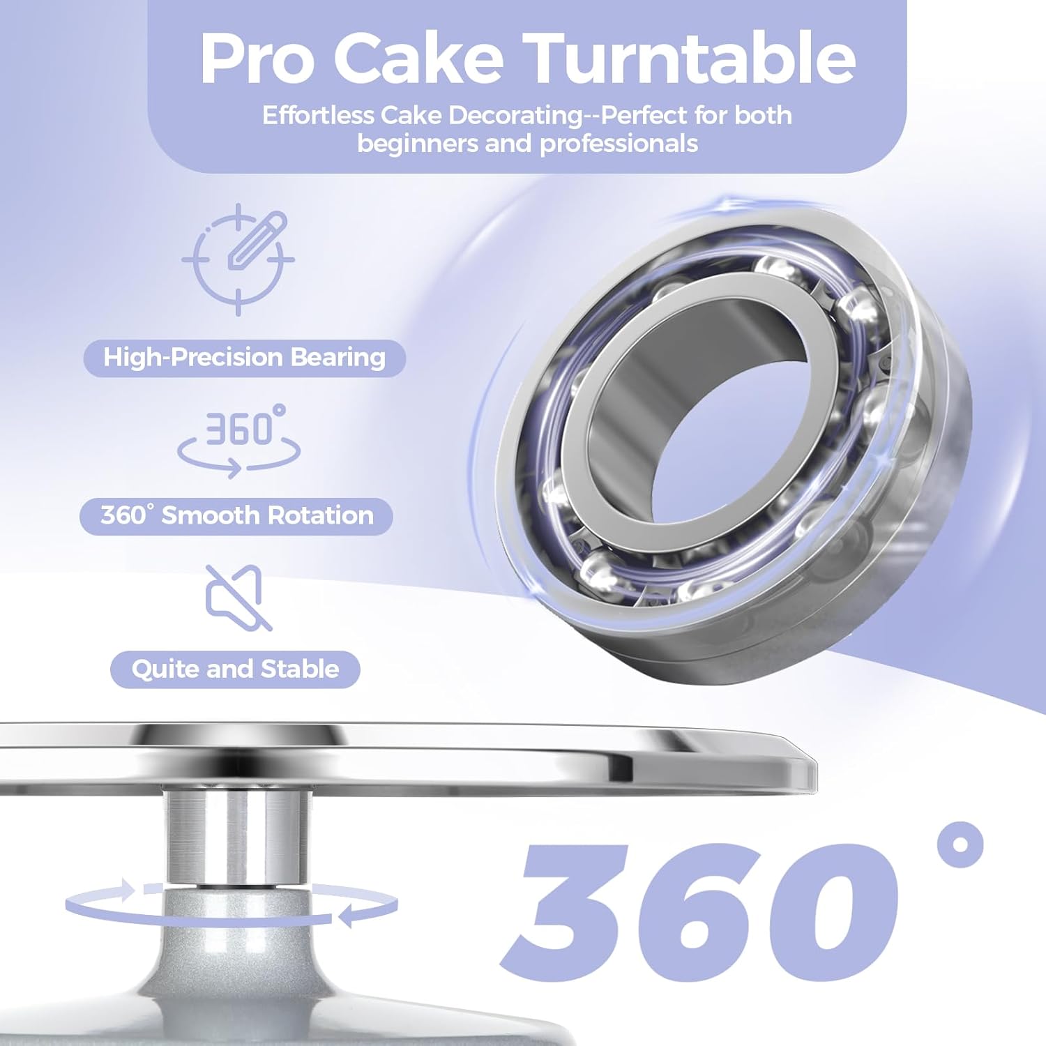 - 360° SMOOTH TWO-WAY ROTATING STAND: Whether you're a left-hander or right-hander, this cake decorating supplies works for everyone, as it can be turned both clockwise and counterclockwise. Thanks to the stainless steel bearing, it'll eliminate horrible friction sound and provide silky-smooth revolving each and every time.