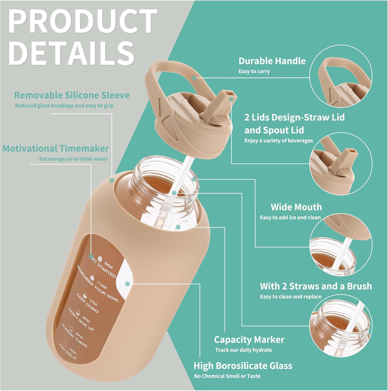 - HALF GALLON CAPACITY WATER BOTTLE: Large water bottle ensures you enjoy enough water without having to refill it frequently. It's perfect for an on-the-go lifestyle! 32 oz, 40oz, 64 oz capacity glass water bottles that meet your different hydrating need