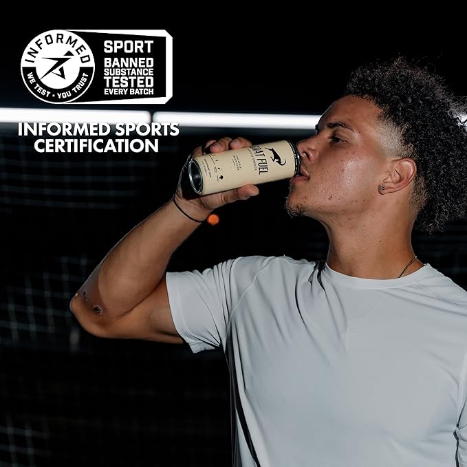 - NATURAL CAFFEINE & BCAAS: Each can delivers 200 mg of caffeine from green tea and coffee beans for a refreshing lift, plus BCAAs to keep you going strong. Whether crushing a workout or a busy day, this smooth, sustained energy lasts for hours—no crash, no jitters. G.O.A.T. Fuel is Informed Sport Certified, guaranteeing it’s free from banned substances—giving you a cleaner, healthier alternative to coffee and other energy drinks, so you can fuel your greatness with confidence. Tasty, refreshing, and made for anytime you need a sustained surge of amino energy for focus and physical performance.