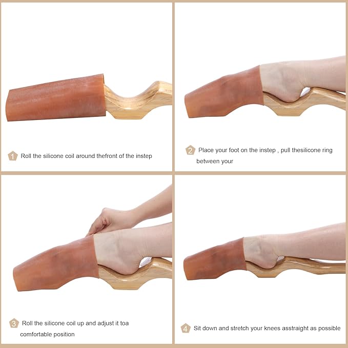 - Tailor Made for Your Feet and Legs: the foot stretcher is tailor made for feet and leg comfort; It's thoughtfully designed to fit around your foot and leg, easing the strain during exercises; You just need to bend your knees, place your toes under the elastic band, and then put your heel on the pedestal and wear the tension band