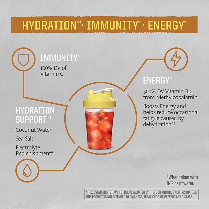 - Benefits: Promotes hydration and boosts energy and helps reduce excess fatigue caused by dehydration. We’ve unlocked the correct ratio that delivers the essentials of hydration, immune support, and energy to help you rehydrate faster so you can soak up every drop of life.