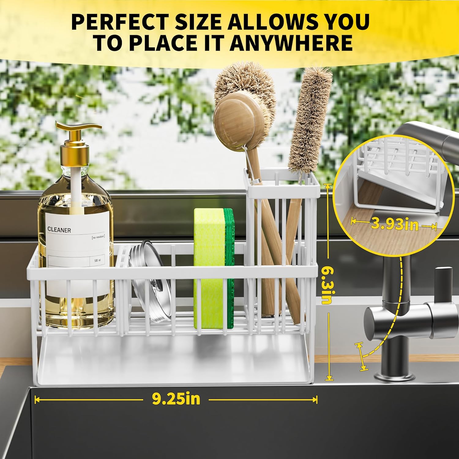 Cisily Sink Caddy Sponge Holder for Kitchen Sink, 304 Stainless Steel Rustproof, Kitchen Sink Caddy with High Brush Holder, Kitchen Sink Organzier Dish Sponge Organizer with Divider(White)
