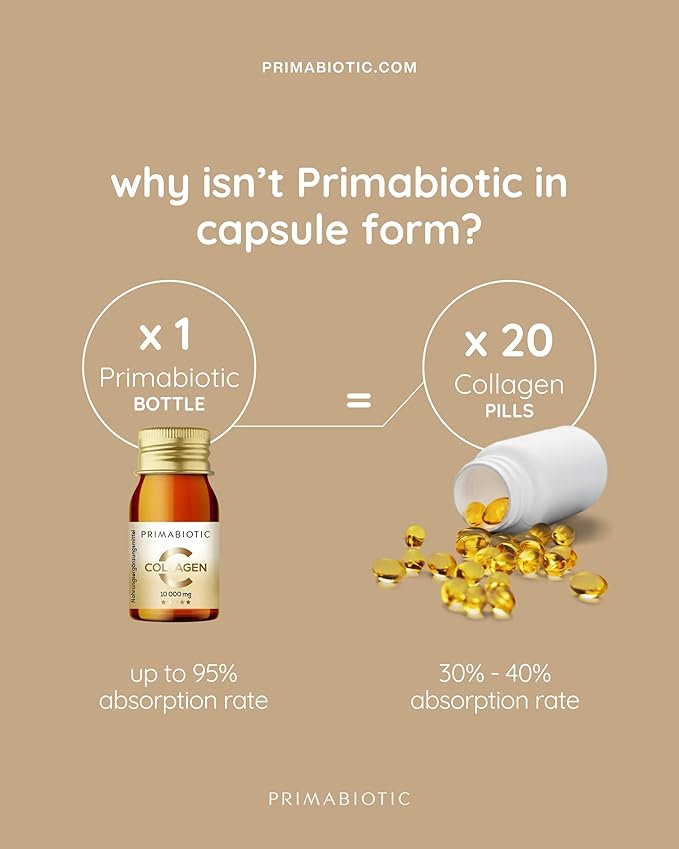 - šæ SHOT FORM: Primabiotic Collagen is available in a convenient shot form, ready for immediate consumption with a delicious apple, peach and lemon flavor. alternative to tablets and powder.