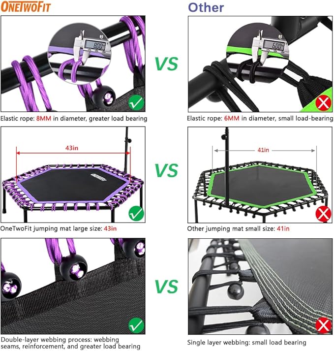 - ☻Good Elasticity☻--- The bungee-rope design system with 42 thickened ropes which are 0.32"(8MM) of diameter provides joint-friendly suspension, reduces noise in maximum extent, affords more stability, and gives you a great jumping experience. Special tool is included for assembly.