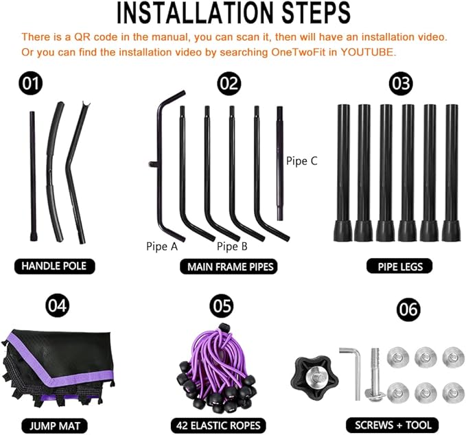- ☻NOTE☻---Trampoline equipment setup requires some physical labor-please read user manual or find the installation video by searching OneTwoFit in YOUTUBE for set-up and it is best having two people available set-up.