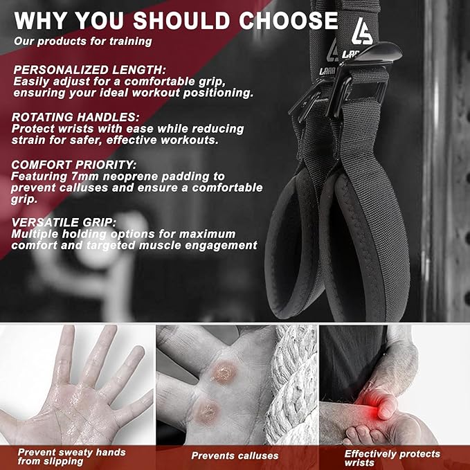 - Optimal Ergonomic Support- With four gripping options, our triceps straps prioritize comfort, reducing stress on your wrists, fingers, and elbows, thus preventing joint injuries during your workouts.