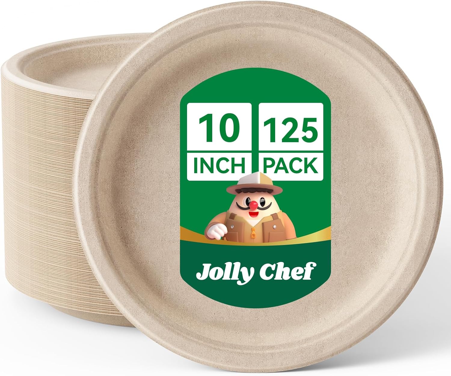 JOLLY CHEF Compostable Heavy Duty Plates 𝟭𝟬 𝗜𝗻𝗰𝗵 [𝟭𝟮𝟱 𝗣𝗮𝗰𝗸] Eco-Friendly Disposable Paper Plates Made of Bagasse Biodegradable Bulk for Party Dinner Sugarcane Fibers Round (Natural)