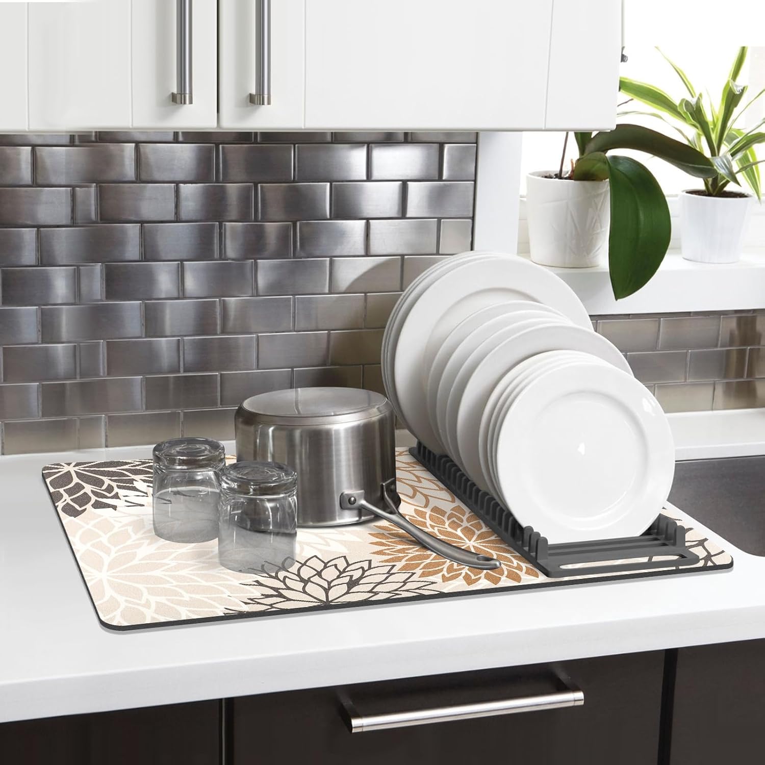 Findosom 2PCS 16" x 24" Dish Drying Mat & 24" x 5.5" Sink Splash Guard, Super Absorbent & Cuttable Dish Mat Drying Kitchen Mat with Brown Floral, Hide Stain Drying Mat for Kitchen Counter