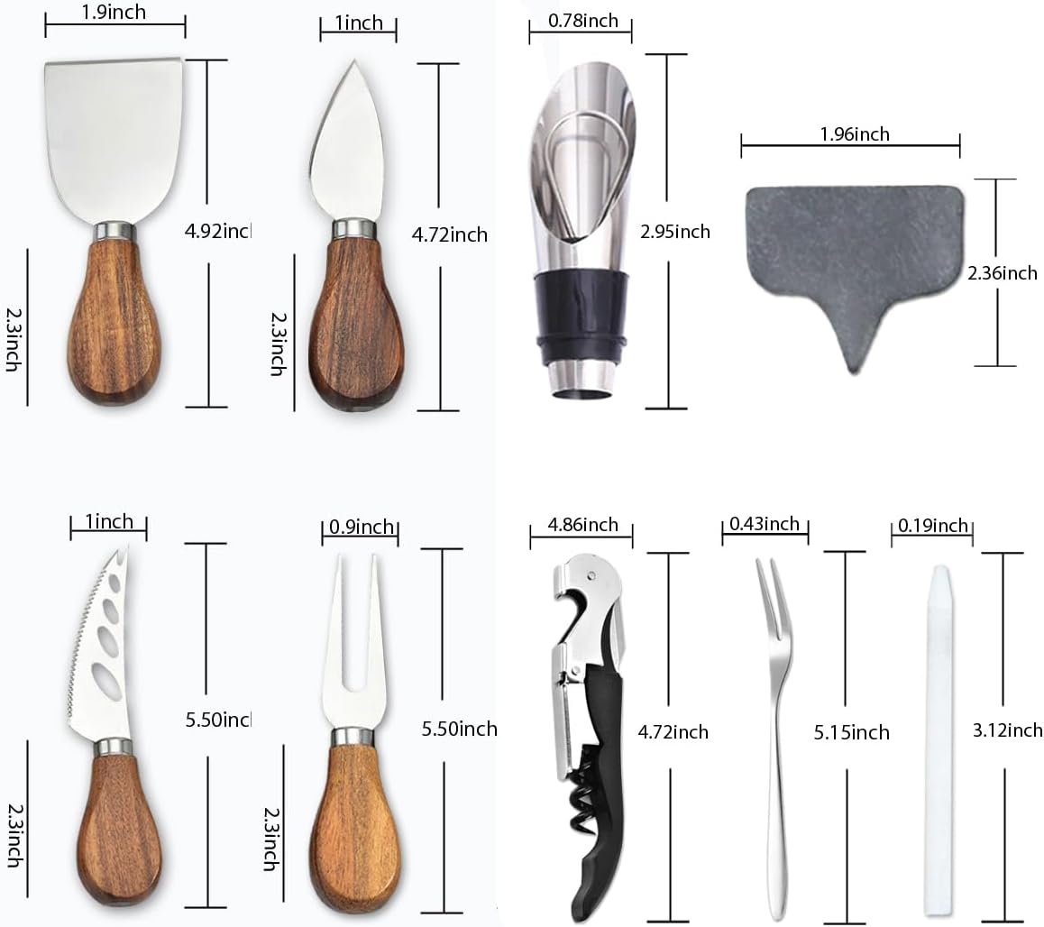 - VERSATILE AND PRACTICAL: This practical cheese knives and wine accessories set easily handles a variety of tasks such as slicing, scraping and spreading a variety of hard and soft cheeses. The delicate corkscrew wine opener and pours make your every wine tasting a breeze, great for birthday, weddings, party, dinner parties or outdoor BBQs.