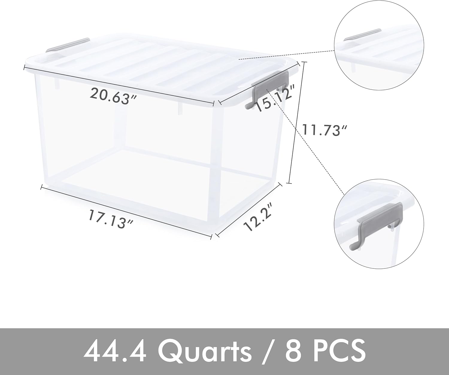 - 【44.4-quart Capacity】Package includes 8 containers for organizing, single measuring 20.63"L * 15.12"W * 11.73"H, capacity 44.4 QT. Suitable for large storage needs in the closet, garage, bedroom, basement, camping, office, etc