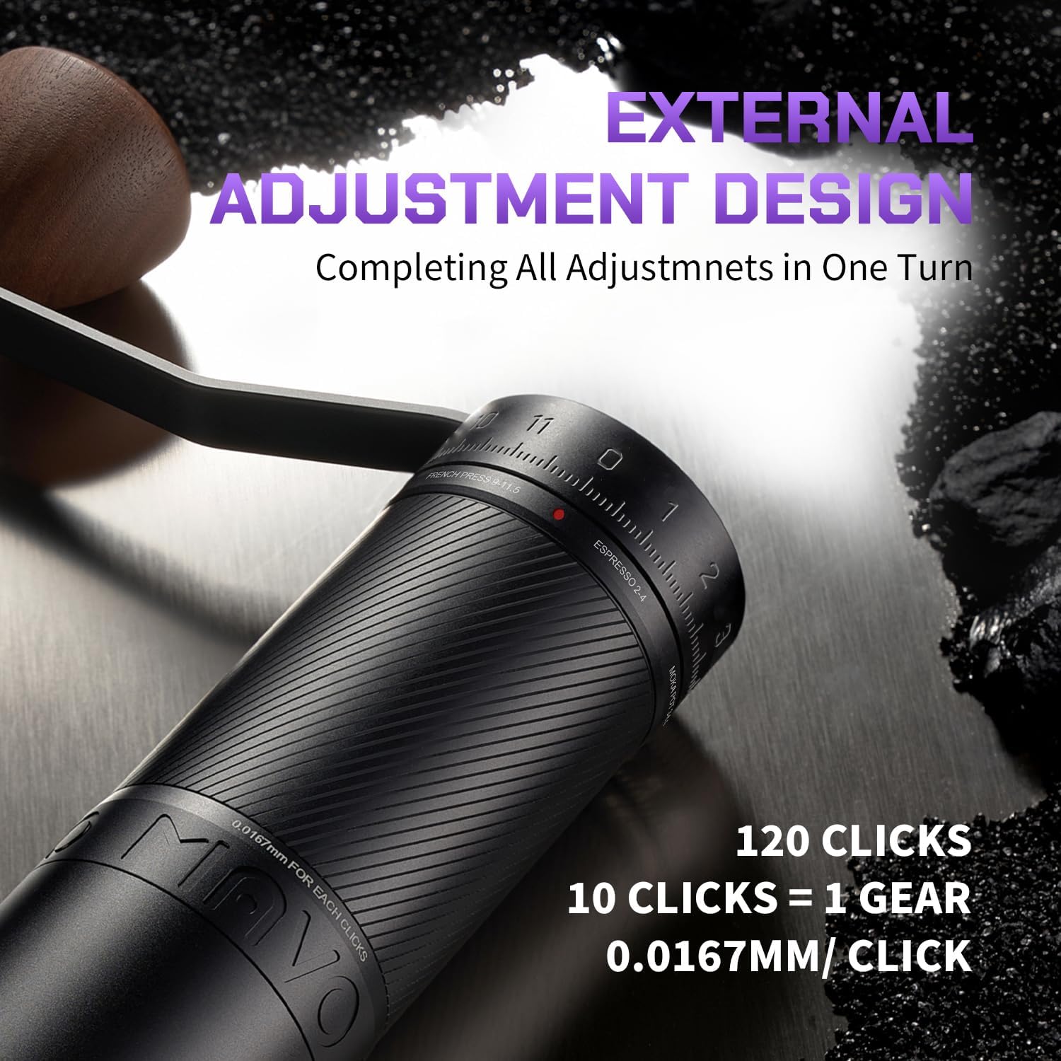 - Innovative Quick Roughness Adjustment - Manual coffee bean grinder is precise to 120 clicks/loop and 0.0167mm per click. Adjustments can be made directly on the outer body without opening the powder compartment. Enables quick adjustment of the desired grinding degree